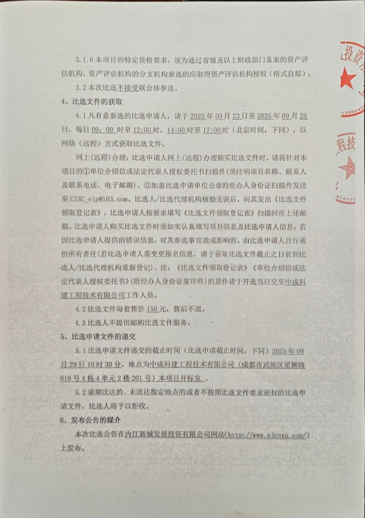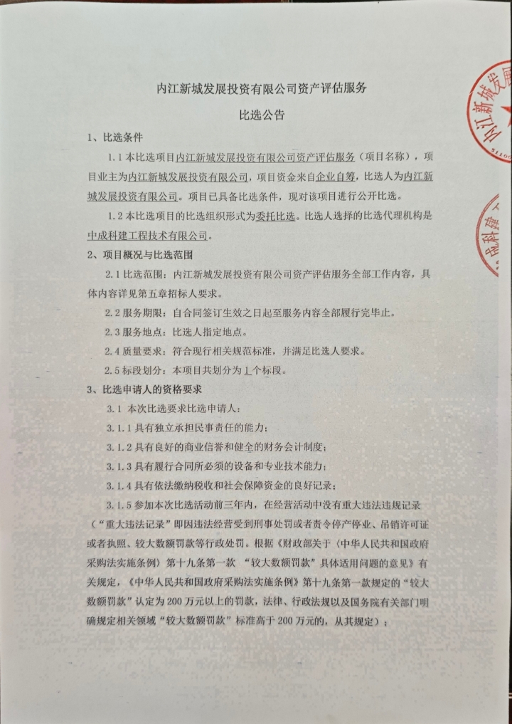 內江新城發(fā)展投資有限公司資產評估服務比選公告